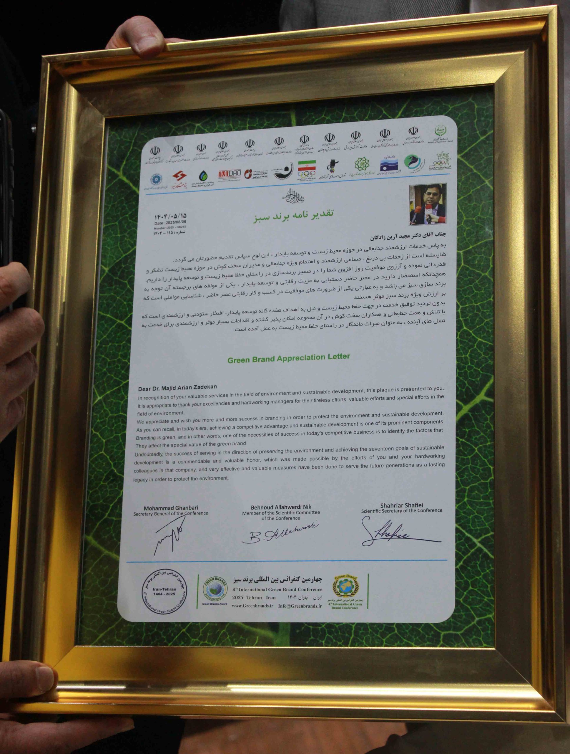وی تصریح کرد: یک بخش از مراسم اهدای جوایز، جایزه جهانی برند سبز، مدال محیط زیست و بخش دیگر تقدیر از اساتید و پژوهشگران برتر در حوزه توسعه پایدار و محیط زیست بوده که ما با افتخار تقدیرنامه‌ای به پاس زحمات و تلاش‌های دکتر آرین‌زادگان در زمینه توسعه پایدار برند سبز اهدا نمودیم که به پاس احترام و تکریم اقدامات ارزشمند ایشان بود.